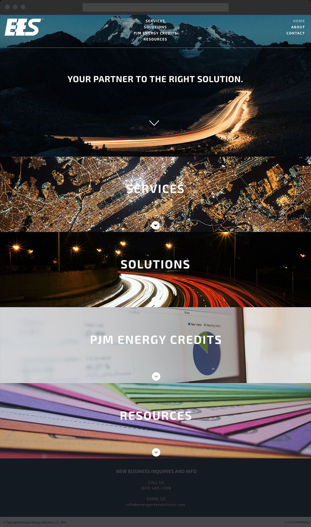 The design and development goal for this website was to make it mobile friendly while modernizing its appearance for the 21st century. The logo was redesigned from the ground-up with a flat and dynamic feel, giving the notion that the company is forward thinking. Additionally, the hidden symbolism easily reveals to the audience that its core business strategies are tied to the energy industry. Each page has a consistent look and feel – utilizing the same typefaces in order to maintain brand integrity, utilizing navigational iconography, and focusing on objective based photography. Overall, this helps to encapsulate and convey key business points as well to the customer for better understanding of its operations.